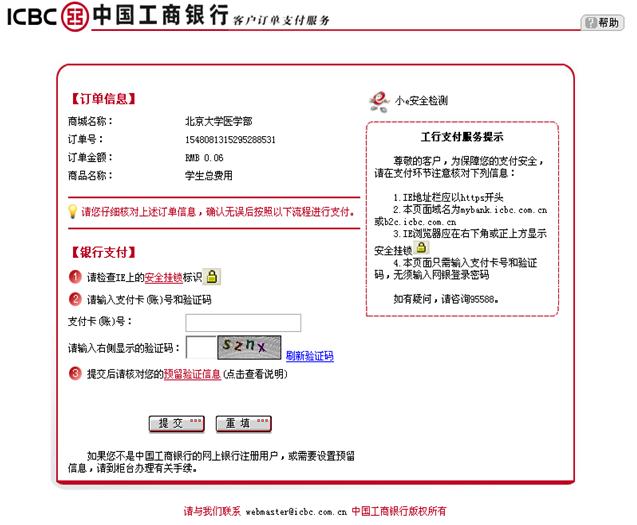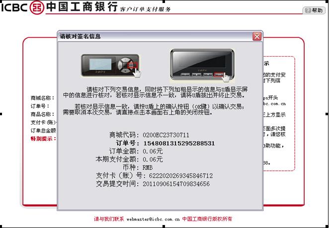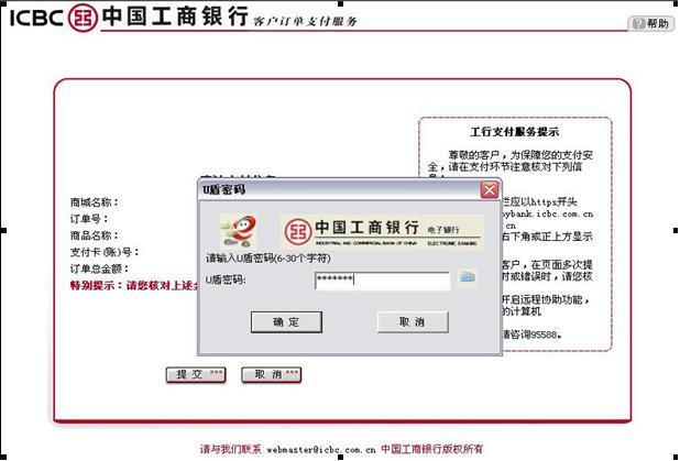 e) 核对订单信息,点击“提交”后出现网上支付的提示信息以及工行的支付页面:
