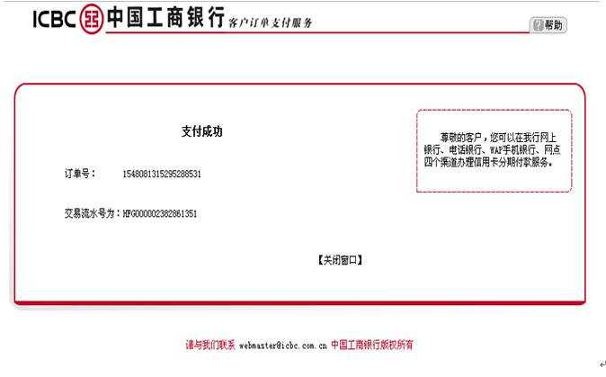 j) 按U盾上的确认按钮后,出现支付成功的提示页面,该页面等待时间稍长,请耐心等待。支付成功页面出现后,点击“关闭窗口”即可。