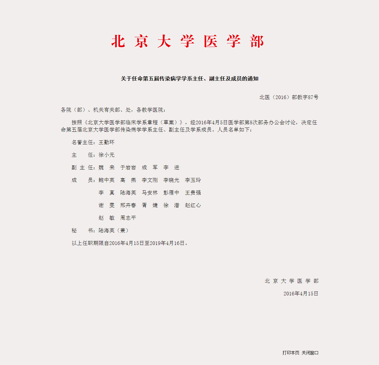 关于任命第五届传染病学学系主任、副主任及成员的通知