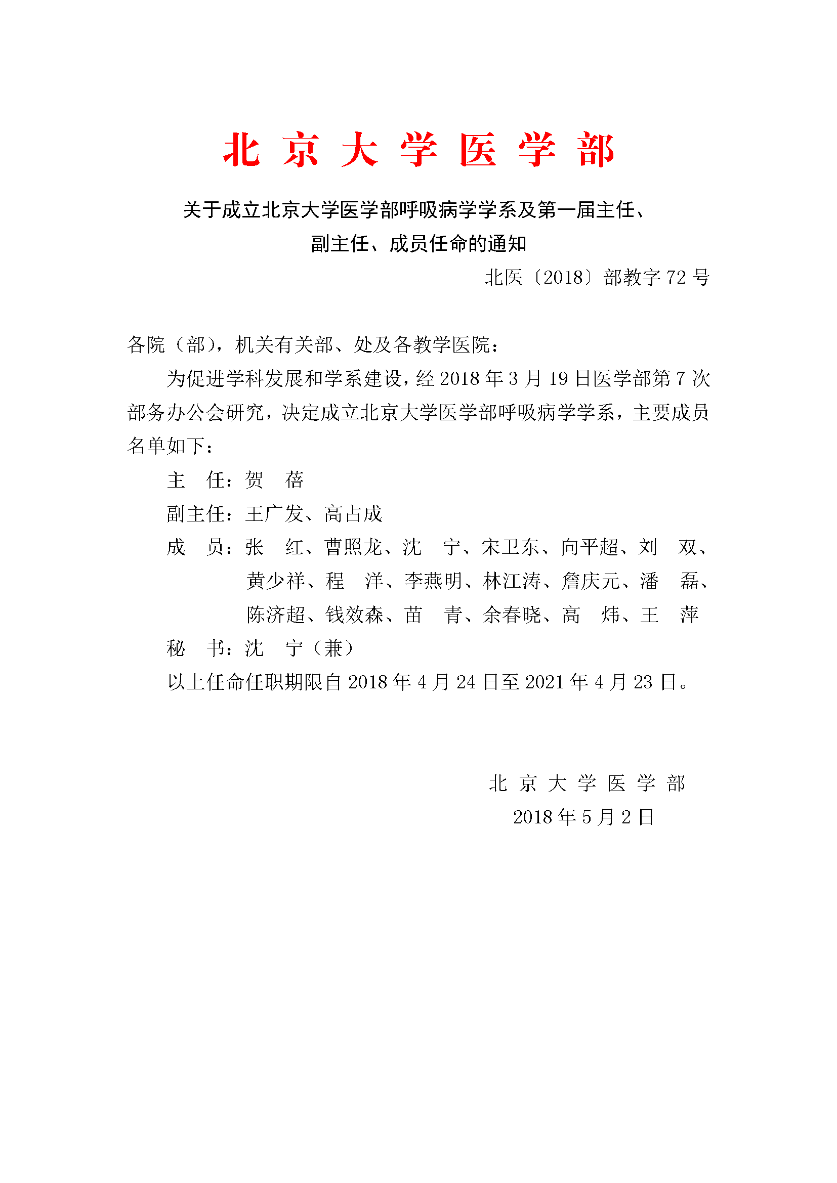 关于成立开云电竞服务好呼吸病学学系及第一届主任、副主任、成员任命的通知