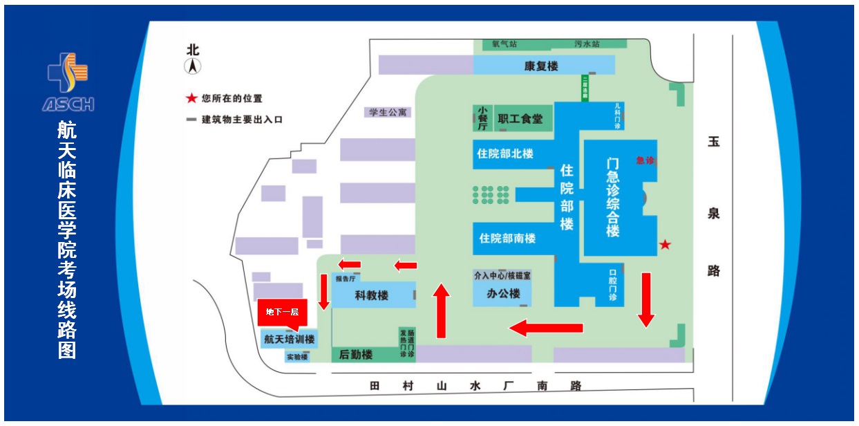 报到的地点:航天中心医院(海淀区玉泉路15号)培训中心地下一层阶梯教室考场位置图