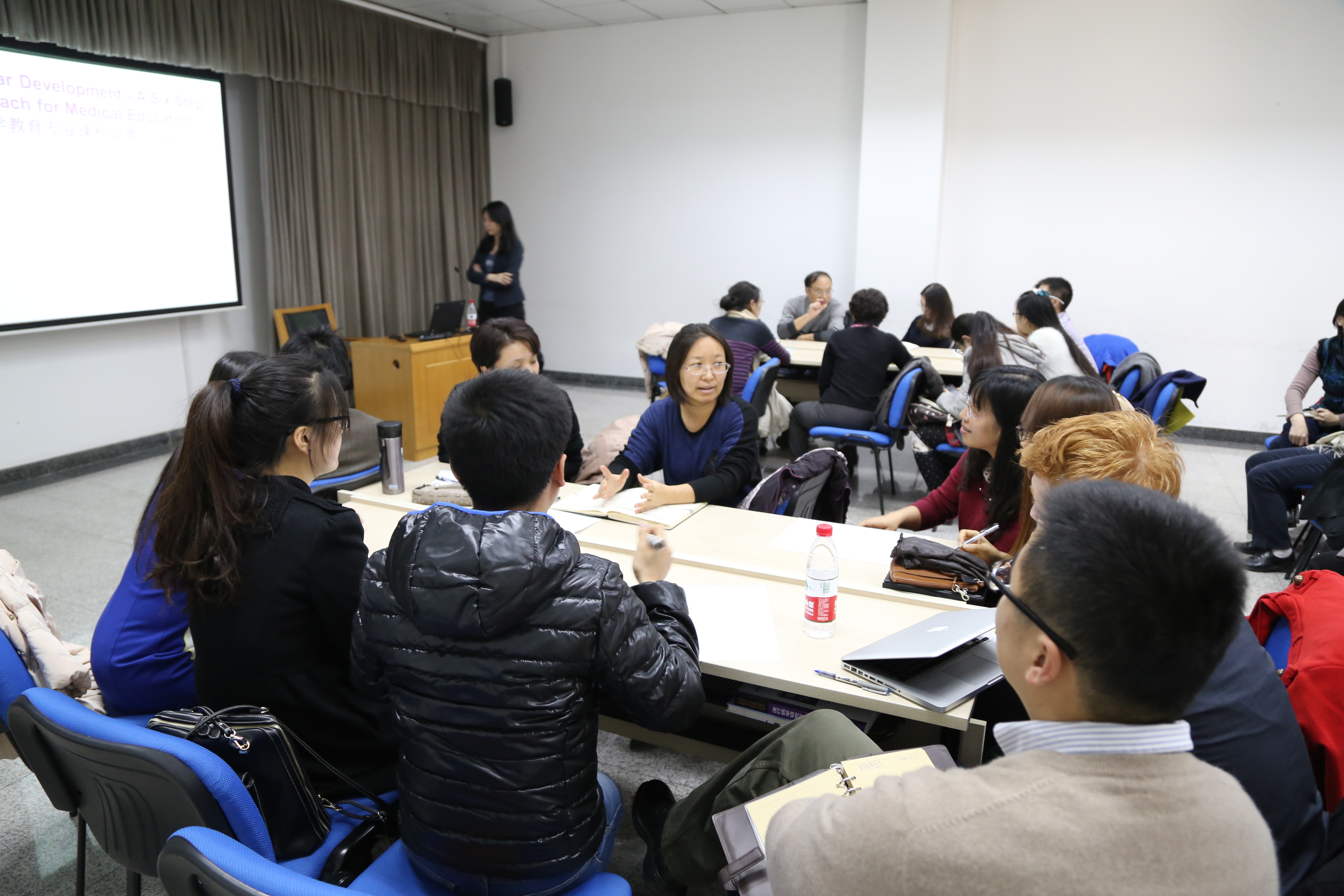 在对这些课程有了一定了解的基础上,各组被要求根据老师事先准备好的假设条件组里抽取,设计与专业学科相关的医学教育课程,并需考虑课程设置需要经过的六个步骤。现场三个组分别抽到三个假设条件的内容涉及教学对象为医学教育硕士新生、医学教育硕士毕业班学生、大学校长或教育领导者,并分别列出了其学生数、可用学习时间及经费。各组讨论十分热烈,不断头脑风暴、集思广益,持续了半小时,最后对小组设计的课程进行汇报展示。设计的课程有将医学教育的知识融会贯通的授课类课程,也有开展实地参观、教学实践、教学研究等实践类课程,其中对经费的合理使用也让各组煞费苦心,其它小组也分别针对汇报组的课程设计进行了提问与交流。