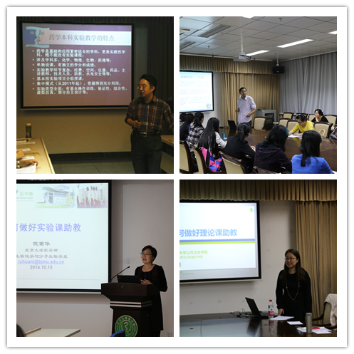 本次研究生助教培训课程分为必修课、选修课及考核作业,共计6学分。必修课课程有开班仪式、助教沙龙及教学讲座,共4学分。2014年9月11日开班仪式上,助教们聆听了《研究生助教制度及能力发展》的报告,了解了北医及医学教育改革发展状况,学习了如何与本科生沟通交流,对助教工作的意义、北医本科医学教育现状及相关规定有了宏观上的了解与理念上的认识。2014年9月25日和10月15日,助教们分别参加了王月丹、吴涛、胡新、倪菊华等教授主持“如何做好理论课助教”、“如何做好实验课助教”沙龙活动,深入了解了助教的责任及不同阶段的工作内容,并在教师的引导下就其在工作中可能遇到的问题及疑惑开展讨论,进而对助教工作有了更为清晰、具体的认识和认真的思考。