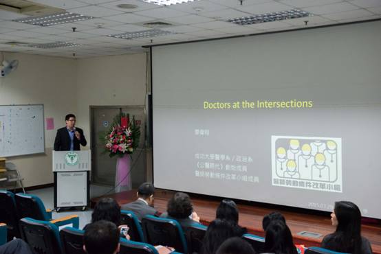 论坛展示之后,《公医时代》的创始成员、“医师劳动条件改革小组”成员之一廖伟翔医师以“Doctors at the Intersections”为题进行了演讲,慷慨演说引发了与会师生的深刻思考。至此,中国医药大学论坛活动圆满结束。