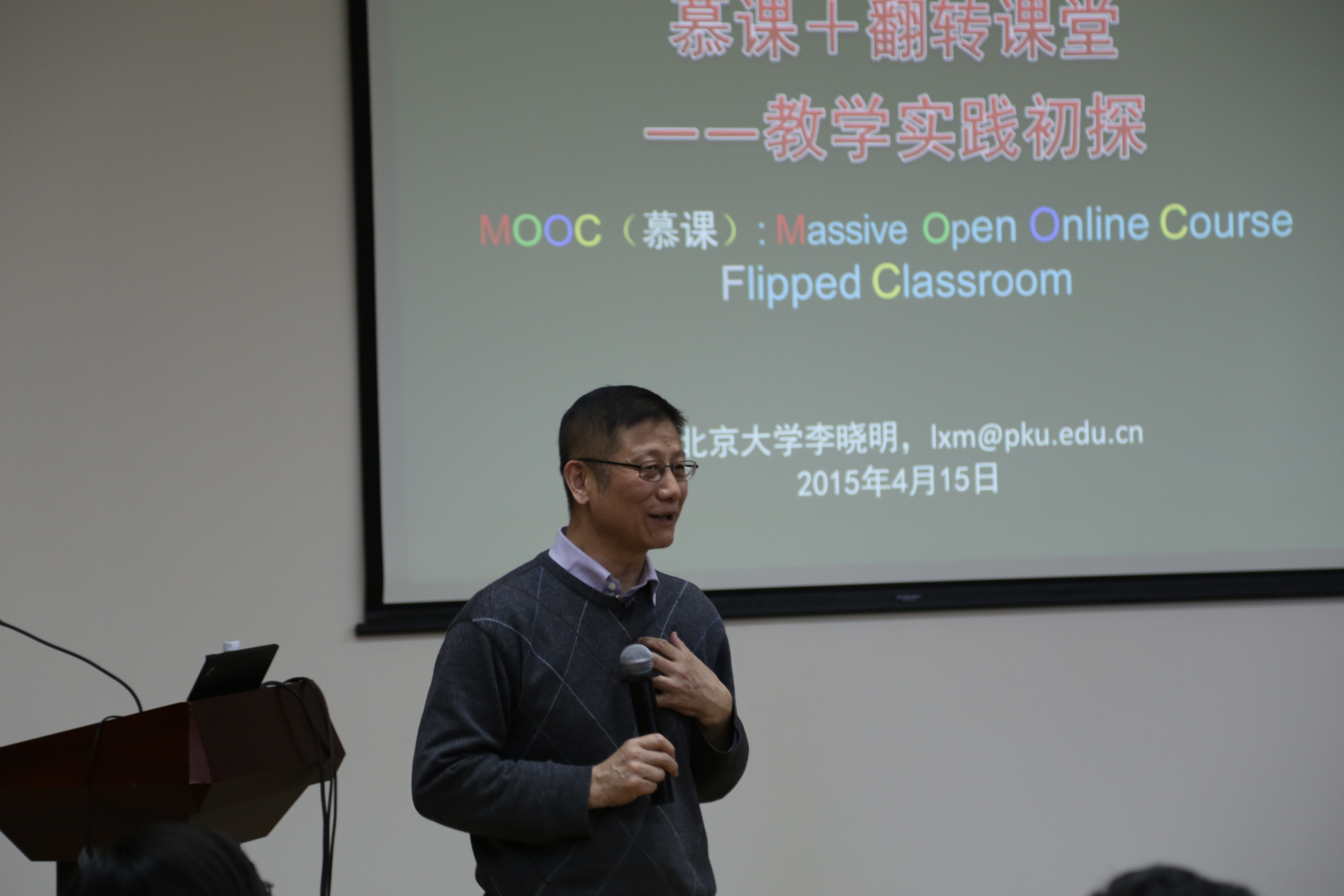 2015年4月15日下午,医学部教学发展中心组织的“慕课+翻转课堂—教学实践初探”教学讲座在会议中心205会议室顺利举行。北京大学校长助理、慕课工作组组长李晓明教授与大家分享了自己参与推进北大慕课建设工作及个人学习、讲授慕课并在校内教学中进行翻转课堂教学的体会。医学部教育教学督导组专家和来自各学院及临床医院的老师、研究生助教130余人参加了本次活动。本次沙龙由教育处副处长蔡景一主持。