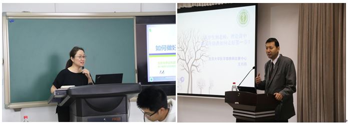 易霞、尹富玲、胡新老师从不同角度向大家介绍了担任实验课助教应该注意的具体内容和相关事宜。易老师从曾任实验课助教的同学们的实际切身体会出发,介绍可能出现的问题,并强调了实验操作的规范性。尹老师着重介绍了履行助教职责时应该把握的原则,就具体情境提出了适当的处理方式。胡老师走入学员之中,向大家展示了专业公司摄制的实验课录像,与大家分享了对实验助教工作的经验与体会,并鼓励在场的各位学员围绕普遍关注的几点问题进行讨论。 通过几位老师的介绍,学员们深入了解了作为实验课助教在教学前、教学中、教学后的工作,明晰了助教工作的原则与规范,为之后担任助教打下了良好的基础。