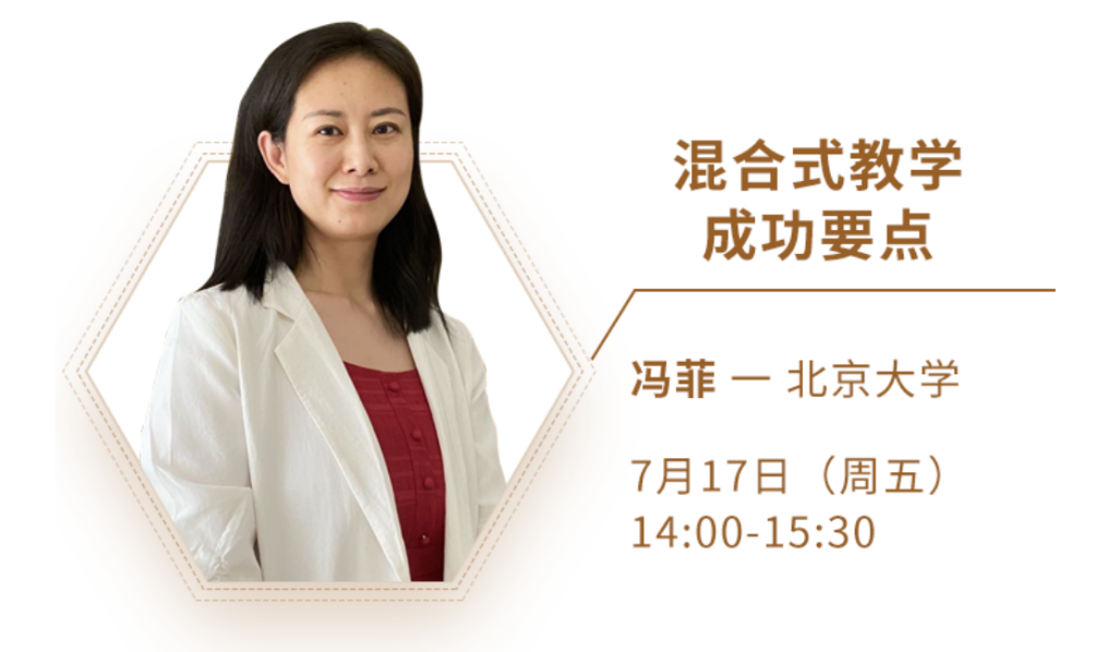 第五场主题为“混合式教学成功要点”。首先,通过介绍国家级线上线下混合式一流课程认定,冯菲老师为大家直观阐述建设一门优秀课程的思路与重点难点,指出混合式教学的落脚点在于促进学生更加高效地学习,应当实现传统面授与在线课程二者优势的有机结合。冯老师将开展混合教学分为若干步骤,包括反思传统教学的不足、进行混合式教学设计等,并结合实例分别进行深入详细的讲解,介绍学术对话型、练习导向型等多种教学模式,使大家对混合式教学的理解更加全面、系统。冯老师强调,应以课程目标为导向,有针对性地进行课程设计,体现课程特色,关注不同维度的混合,提供适度的学习支持,最终实现教学质量的提高。