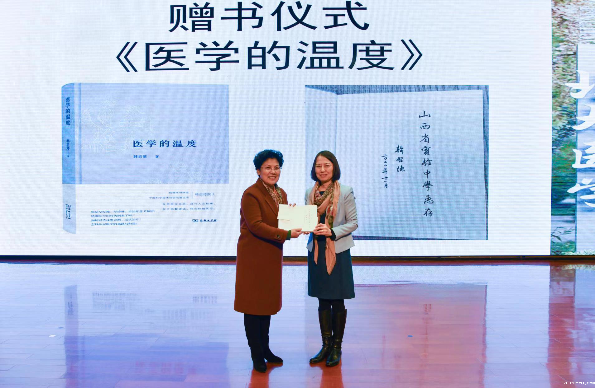作为拥有40年校龄的北大医学人,段老师还用一系列珍贵的老照片,与中学生们分享了她本人选择北大医学的心路历程、充实又不乏挑战的求学之路、忙碌而收获满满的临床科研,以及令人感动的师生情谊和医德传承。段老师分享的个人经历,正好呼应了《医学的温度》一书中所描述的医者仁心。此次段老师还带来了由本书作者韩启德院士亲笔题字和签名的《医学的温度》,分别赠与山西省实验中学和山西大学附属中学。两校校长代表全体师生接受赠书并表示将会把此书保存在学校图书馆,勉励更多学生追求崇高的医学事业。
