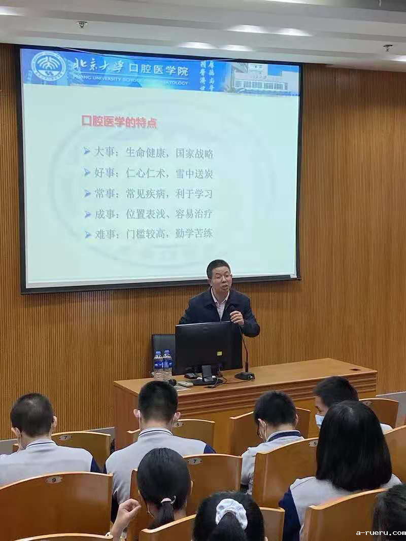 作为一名福建人,王老师首先以自身成长学习、工作经历与学子们拉近了距离,也表达出了其浓浓的爱国热情。作为一名经验丰富的口腔医生,王老师结合自身的临床医疗实践为学生们介绍了口腔疾病的特点与自我防护的常见方法,强调了早期预防和提升自身健康素养的重要性,并制作了简单易懂的动画片为同学们解释了牙周病、智齿盲袋等的成因,通过大家所熟悉的口腔疾病与生活经历给同学们上了一堂生动的科普课。最后,王老师向大家介绍了口腔医学的特点,从“大事”“好事”“常事”“成事”“难事”等几个方面进行了深入细致的剖析,向同学们展示了随着社会发展,口腔医学迎来的广大发展前景与未来。医学,作为与人类生命健康紧密相连的学科,具有“心地善良”“乐于沟通”“勤奋负责”“心胸开阔”等特征的人比较适合学医。他也期待有更多年轻的优秀学子能够选择口腔医学,选择北大医学,一同守卫生命健康。