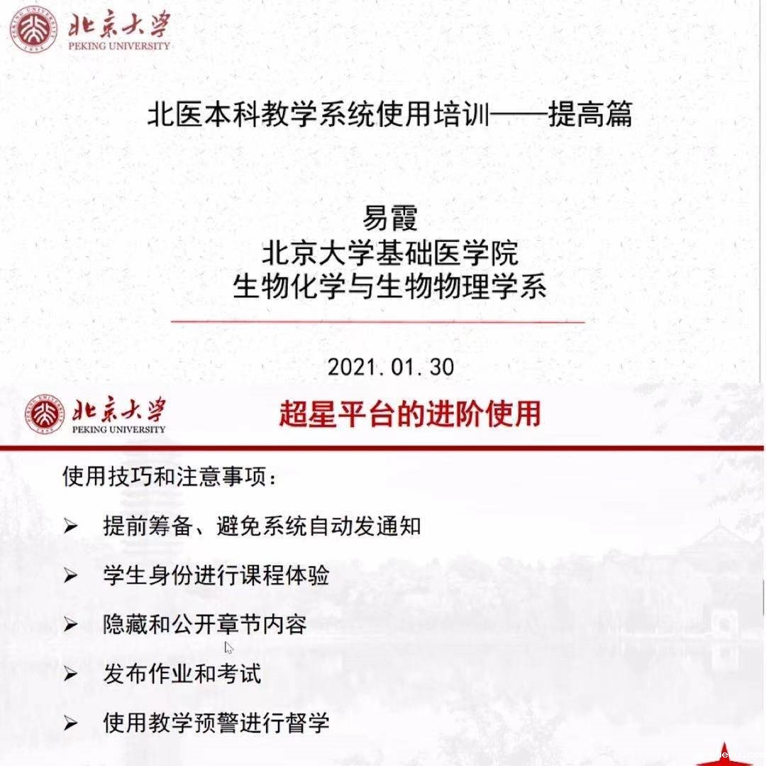 2021-03-01【临床培训】北医本科教学系统使用培训成功举办2021年1月医学部教师教学发展中心采用腾讯会议直播方式,邀请基础医学院生物化学与生物物理学系副教授易霞进行北医本科教学系统使用培训。 -