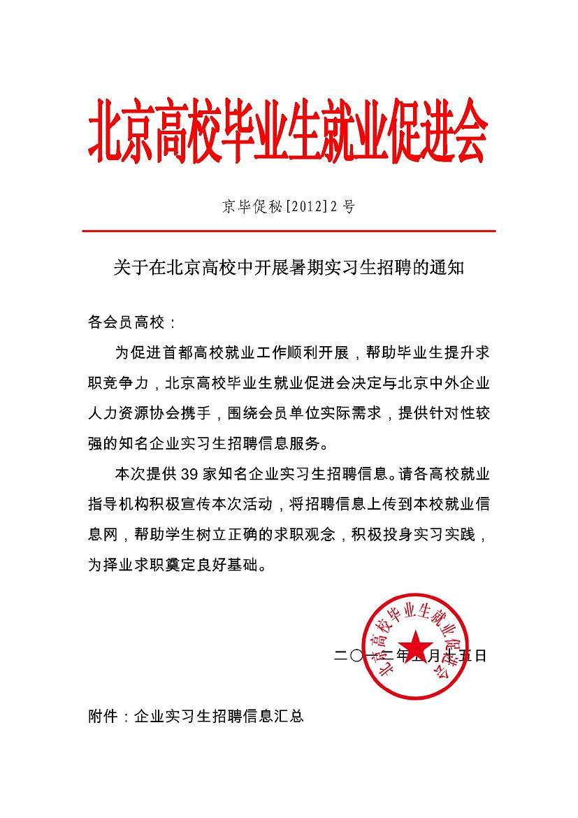 转发《关于在北京高校中开展暑期实习生招聘的通知》